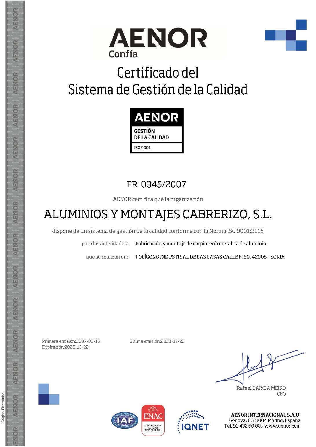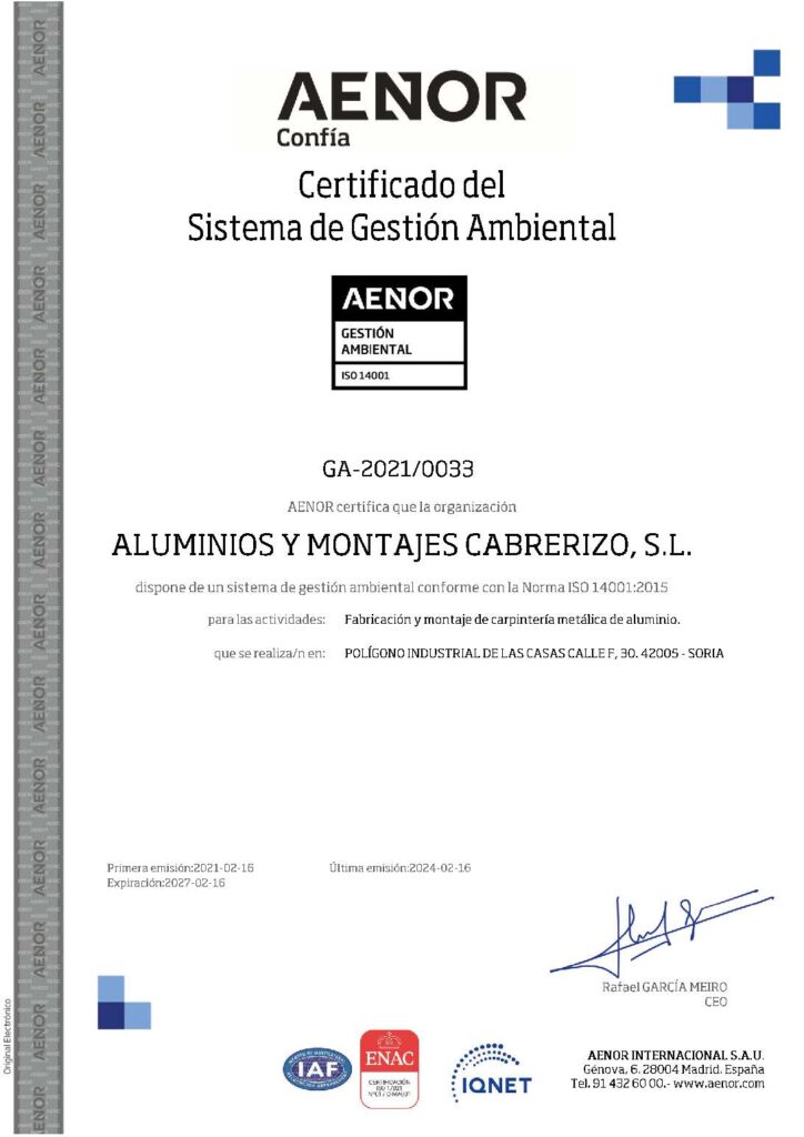 Aluminios y Montajes Cabrerizo, S.L. es una empresa especializada en la fabricación y montaje de carpintería de aluminio, vidrio y soluciones constructivas asociadas, certificada conforme a las normas ISO 9001:2015 e ISO 14001:2015.